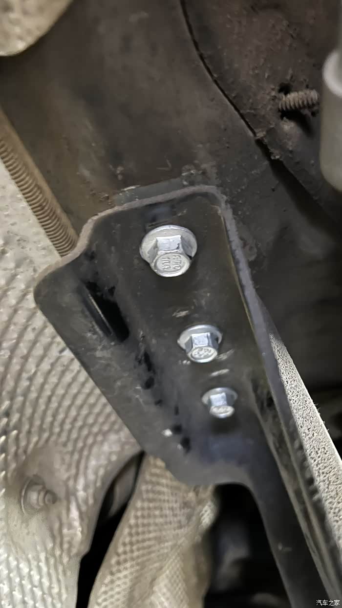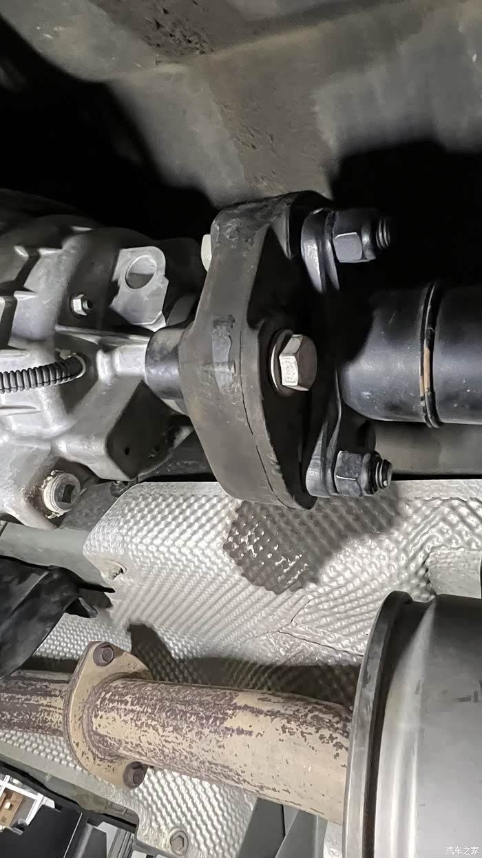 我把论坛里车友改的方案给师傅看了看,在我要求下,一致同意改,改!改完再说,光说不管用,在调悬置时一定要用工具从下面顶着变速箱,因为加垫片时需要把螺栓拿下来换新的再加垫片,把传动轴与分动箱连接螺栓松开一些,不要卸下来,这个时候可以看到法兰上面有间隙,这时慢慢下放变速箱找位置,分动箱和传动轴法兰水平时即可,地坑下面位置有限,师傅是眼测大概,加了两个3mm垫片,一共垫6mm,但还是有点间隙,师傅说先垫6mm试试,担心前面发动机变速箱和分动箱降得过多有其他影响,装上试车没感觉,因为已经快10点了,车跑了20多公里和室外温度6度左右,对共振影响很大,可以说没有感觉,故回家等第二天早上测试。