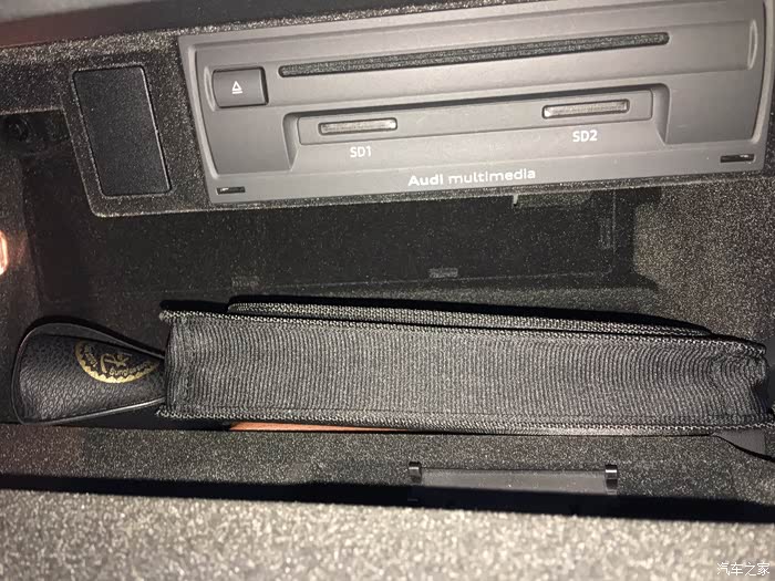 副驾驶前储物间,奇怪的是插不了SIM所以奥迪自带网络功能没有办法使用。后来查了查发现没有插SIM卡的选项。
