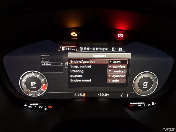 3.TTRS真的是2倍TT价位买了舒适和性能。在舒适模式下方向盘很轻、悬挂比较软、排气声音就好比开了一辆普普通通轿车。在动态模式下不管是方向盘变的比较沉、悬挂变的很硬很颠、排气阀门打开时刻准备着参加战斗。