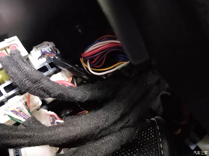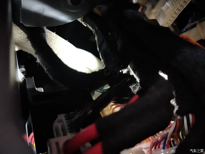 关键的一步也是考验你耐心和技术的一步,这一步需要找出准备穿过A柱去到门板的一束没有包裹海绵的线,强调一下是没有包裹海绵的线束,用右手伸进去顺着进线A柱孔位摸一摸可以顺利找到,你要确定这束线是进A柱的才对。