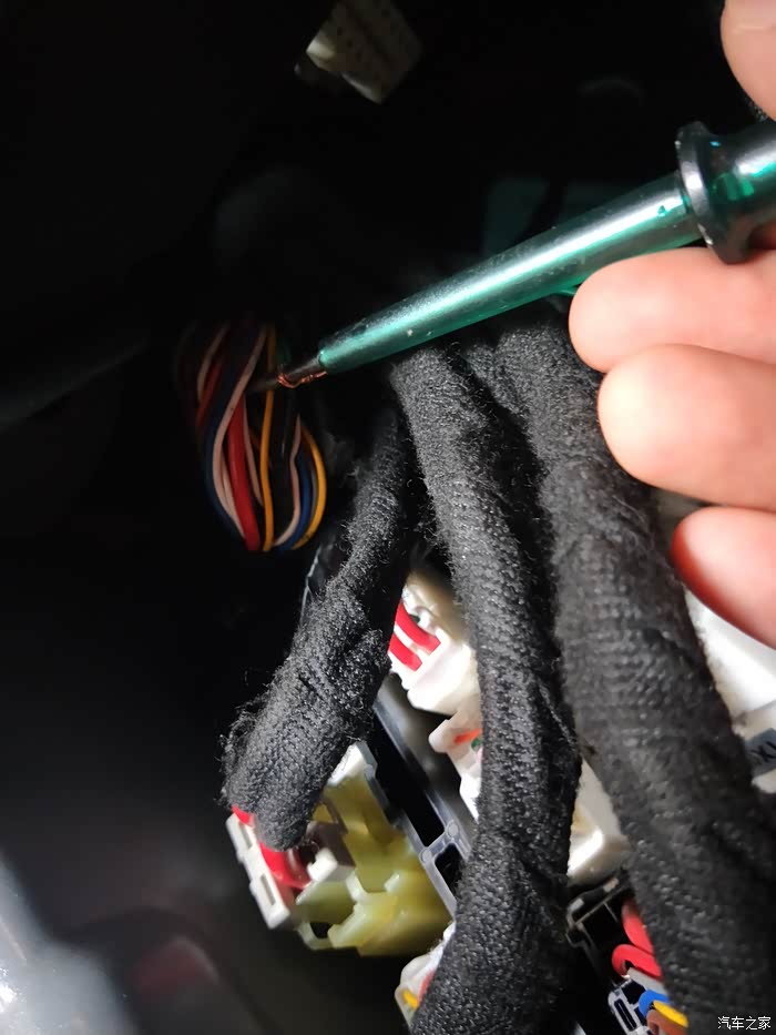 这一步考验技巧技术喽,这里边有四条白色线(这里特别提示20款是两根白色线,图片插入的是17款和19款的线束),其中一根是控制车辆锁车键的,我们需要用卤素灯泡的试灯一头打搭铁,另一头用针脚扎白色线听到负极触发车门上锁的声音就对了,运气好一次就试到到了,运气不好四条线都要试一遍。总之四条白色线,只有其中一条是负极触发上锁的信号线,这个线最终的目的是为了控制锁车关闭车窗和全景天窗。