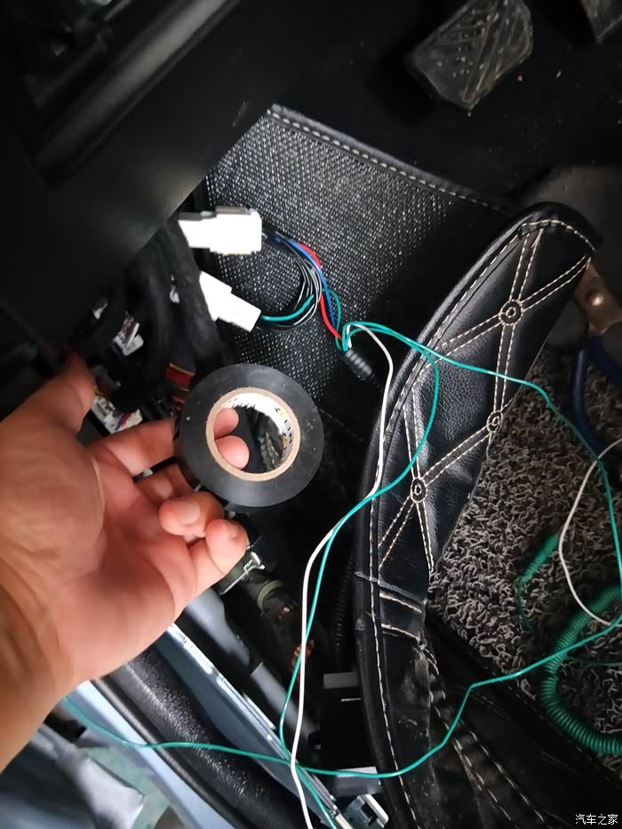 升窗器的绿色线顺着玻璃,然后到A柱顺着装饰板的缝隙一直塞进去往下拉,拉到我们主驾驶左脚位置固定好即可。