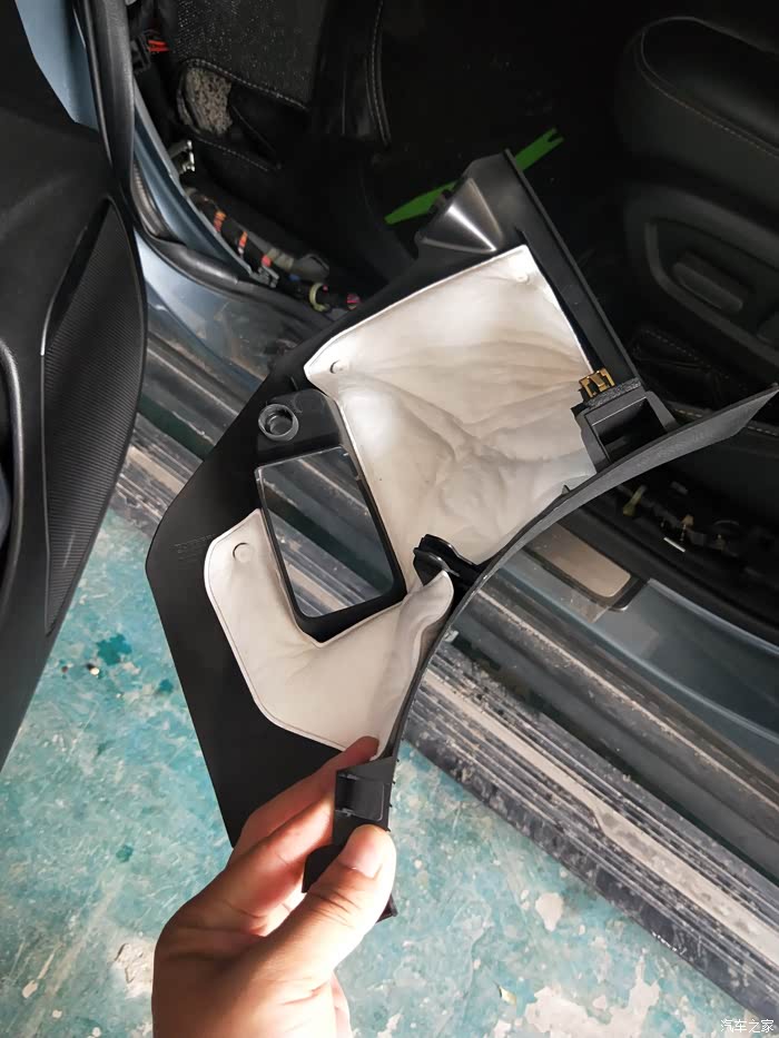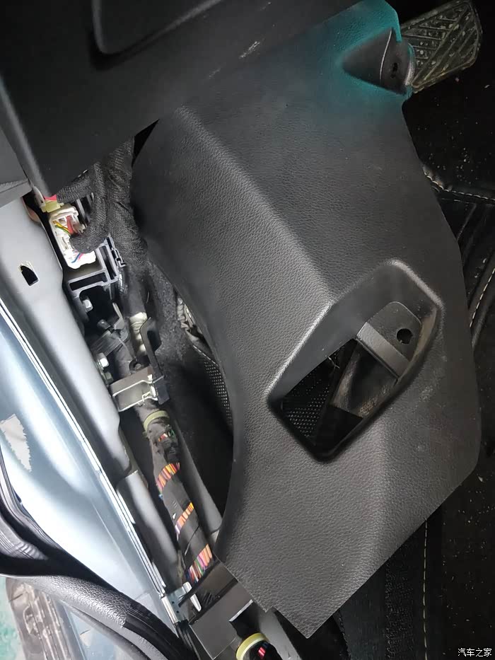 主驾驶左脚旁边的三角盖板先把两个塑料扣给拆掉,然后抠起来,也可以直接用韧力扣下来,有圆孔位的两个地方就是有塑料扣的。