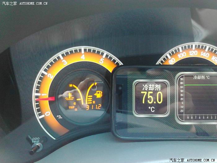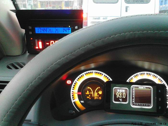 在93度时,散热风扇低速运转介入,降到88度时停扇,但风扇高速是什么时候介入,没测到过,风扇高速工作的橙光灯还从来没亮过。开不到更高的水温,这要加大马力折磨发动机才行,损车费油,舍不得。