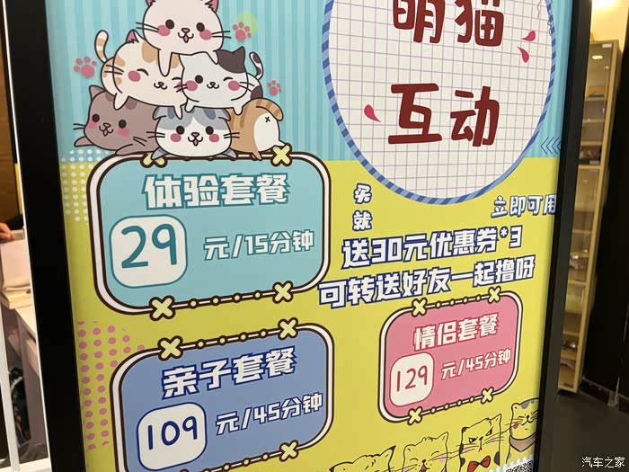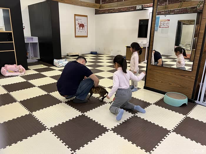 原来闺女是被旁边的猫舍吸引了,估计她这个20后是不懂我们九零后的生活了,闺女把我拽到猫舍前面,看着里面照顾猫咪的小姐俩,说着也想去。我说下周爸爸带你俩吧。这时候里面的一只小猫咪狠狠的看着我,似乎说着,为什么不让孩子玩,额。萌猫互动的价格也还能接受,下周带孩子来玩一玩,培养她照顾小动物的爱心。