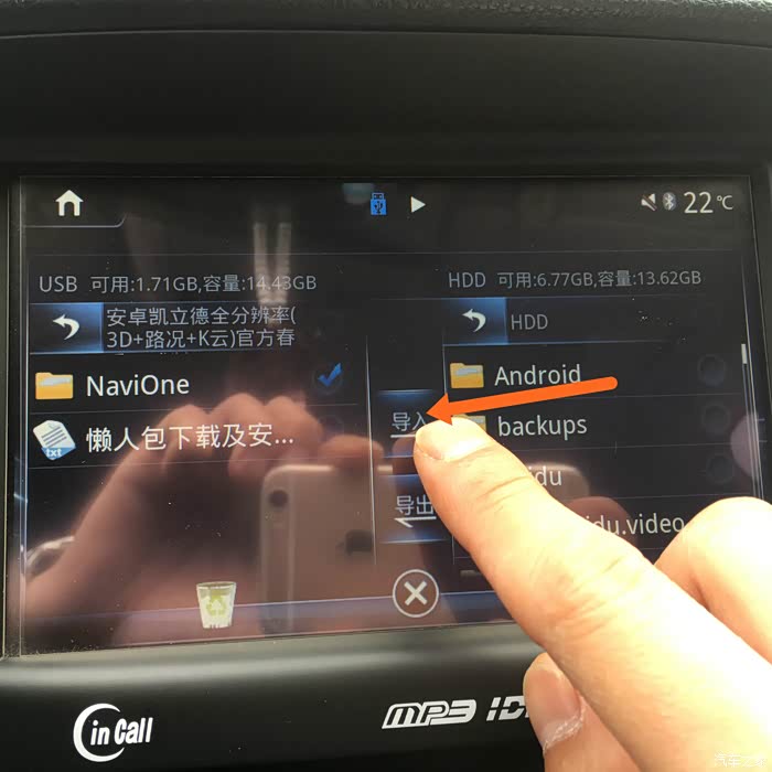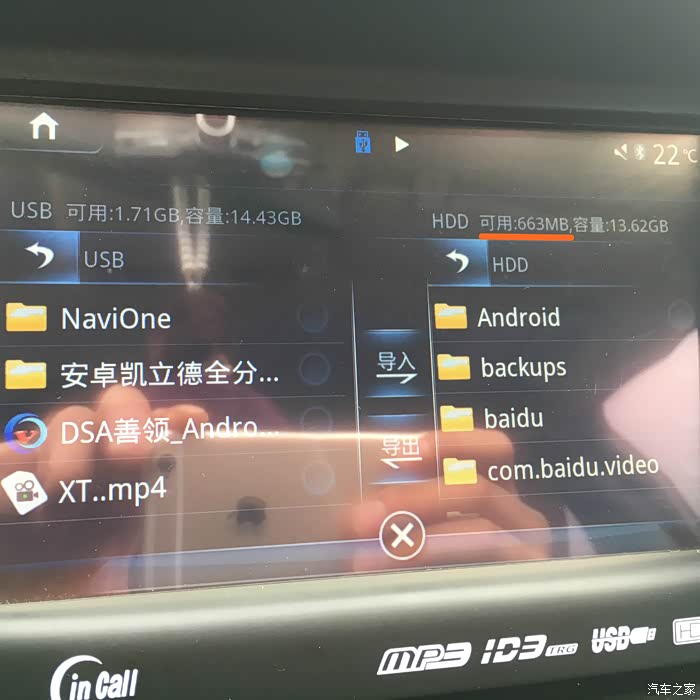 进入文件管理后的界面,左边为U盘内的文件,右边为车辆HDD内的文件,请注意,HDD有容量显示,请保证HDD容量至少有6.7G以上的空间供导航软件导入,如空间不足,请在此界面内自行选择删除无用的软件和文件。