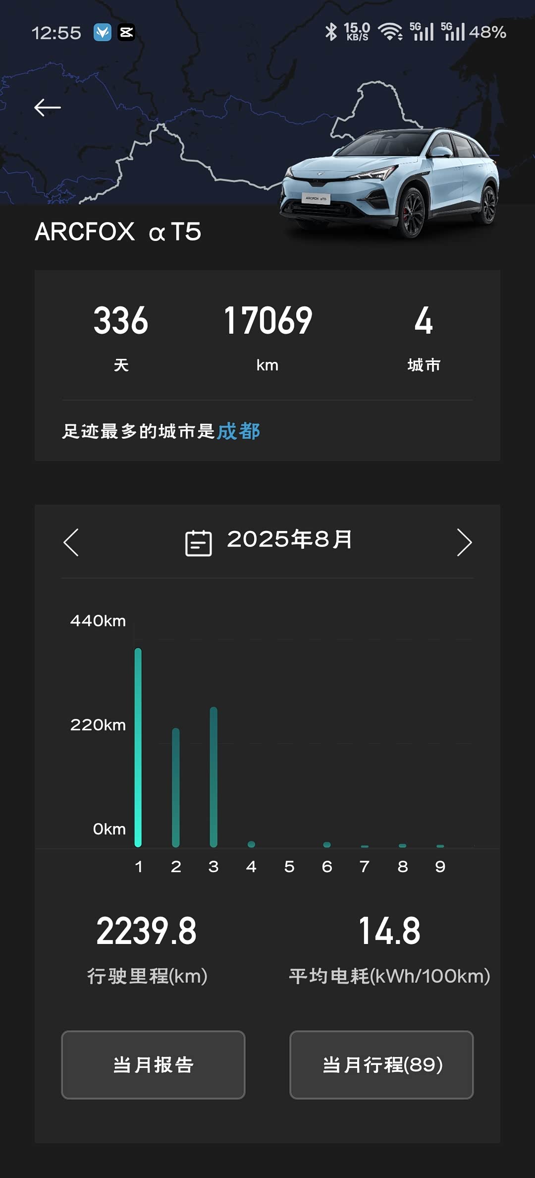 7月的时候,车开得不算多,里程938.5km,平均电耗15.8kWh/100km 。没想到8月来了个大变化,里程直接飙到2239.8km,电耗反倒降到14.8kWh/100km ,这得归功于月初的川西小环线之旅。说真的,极狐的续航表现太让人惊喜了,尤其是跑这种长途,表显续航和实际里程的偏差特别小,完全不用为“里程焦虑”犯愁,规划路线时心里特有底。