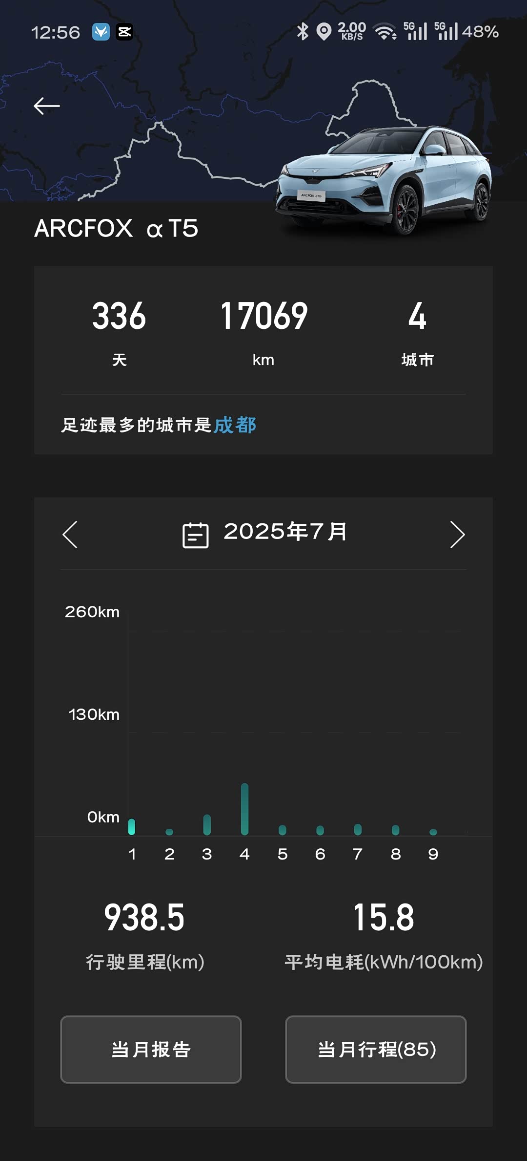 我的极狐阿尔法T5已经陪伴我336天啦,总里程17069km,足迹最多的城市当然是在本地成都啦,到处跑的日子里,它可没少出力。这一年多下来,越发觉得选对了车——极狐这车是真靠谱,不光续航扎实得让人踏实,底盘调校也特别舒服,过减速带、走烂路时,滤震效果特别好,坐在车里几乎没啥颠簸感,哪怕长途开一整天,也不会觉得累。