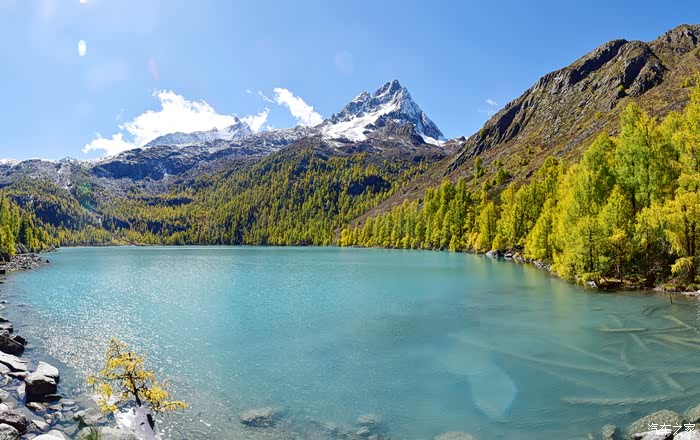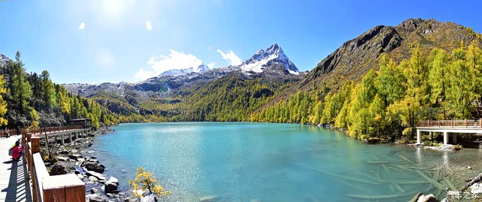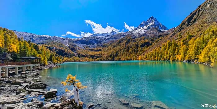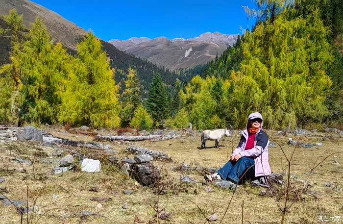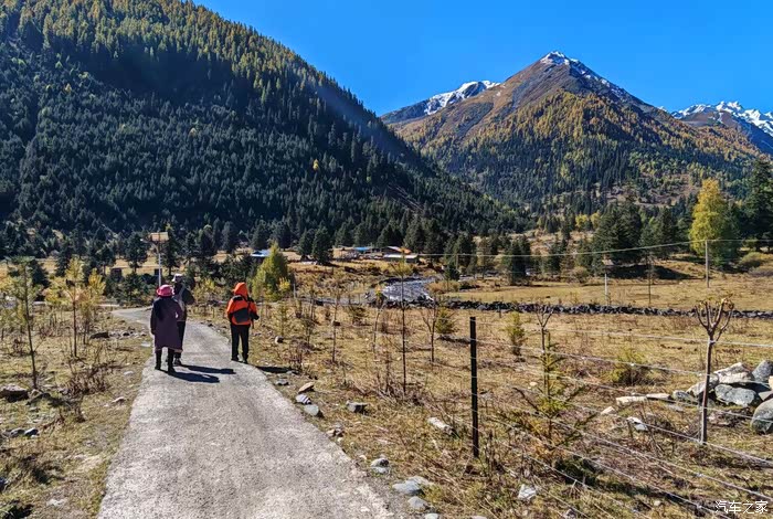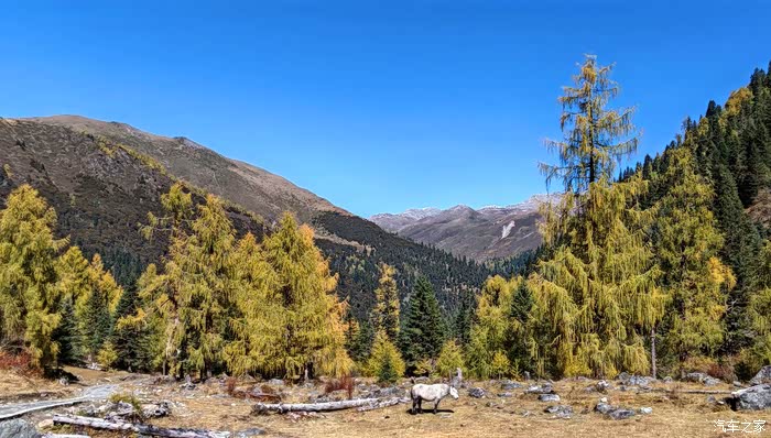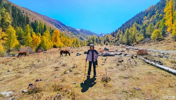 沿途的风景美得让人心醉,溪流潺潺,草甸金黄,树木丛生,雪山高耸……