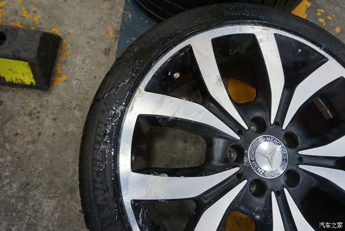 拆下来的4条轮胎中有3条是老弱病残。看看,这个是最严重的,高速蹭马路牙子,轮毂有轻微变形,轮胎直接破掉一层皮。还好,防爆胎够厚,这个状态下我开了估计有5000多公里了,如果是一般轮胎应该早就鼓包了吧。