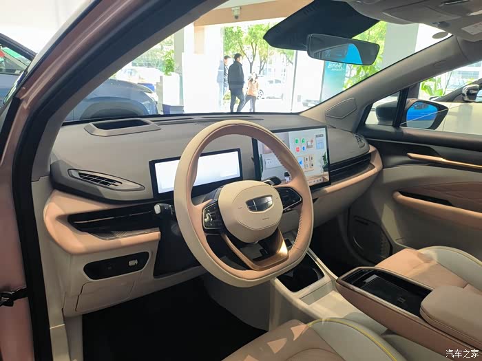 几何m6内饰也是我比较心动的,布局非常简洁,而且特别清新,一眼就动情了,中控台的设计感还是比较强的,进入车内就能够感受到一股清新的风格,中控台采用上深下浅的色彩搭配,粉嫩的风格是比较讨年轻消费者喜欢的。空调出风口采用狭长的设计,内部的金属饰条则比较精致。中间搭载一款大尺寸液晶屏,车机系统在操作流畅度和可玩性方面可以给个好评,新车搭载的是HarmonyOS系统,全新的HarmonyOS系统语音识别率更高,操作更流畅。双色方向盘的颜值很高,抓握感是很舒服的,上方的物理按键则采用黑色烤漆元素点缀,细节处理精致。值得一提的是,居然配备了怀挡设计,这一下高级感就来了,让操控区的空间更加宽敞了。