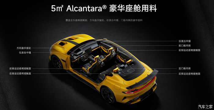 材质升级:全车21处碳纤维组件(总使用面积5.5m?),5m? Alcantara翻毛皮包覆,24K金车标与赛道刺绣标识。座椅配置:黄/黑双拼运动座椅,支持通风、加热、按摩,头枕扬声器与专属UI设计提升沉浸感。