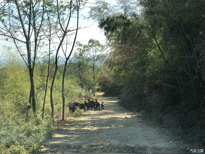 下山的路上遇到了一群山羊,看到这群羊熟悉的躲避车辆,女朋友笑着说这是“常客”。