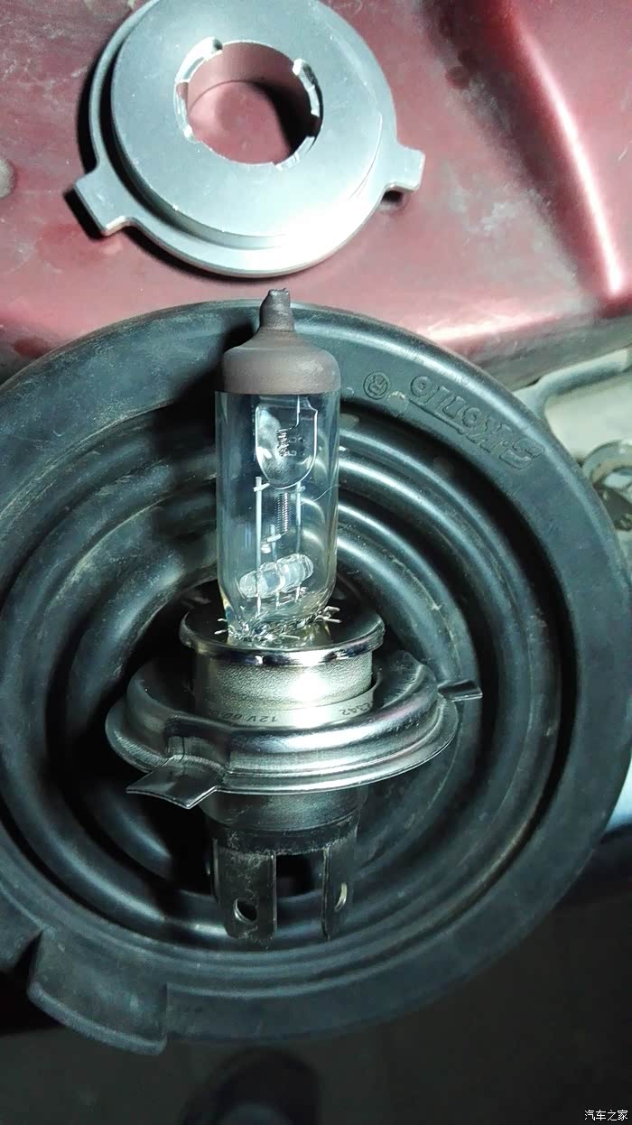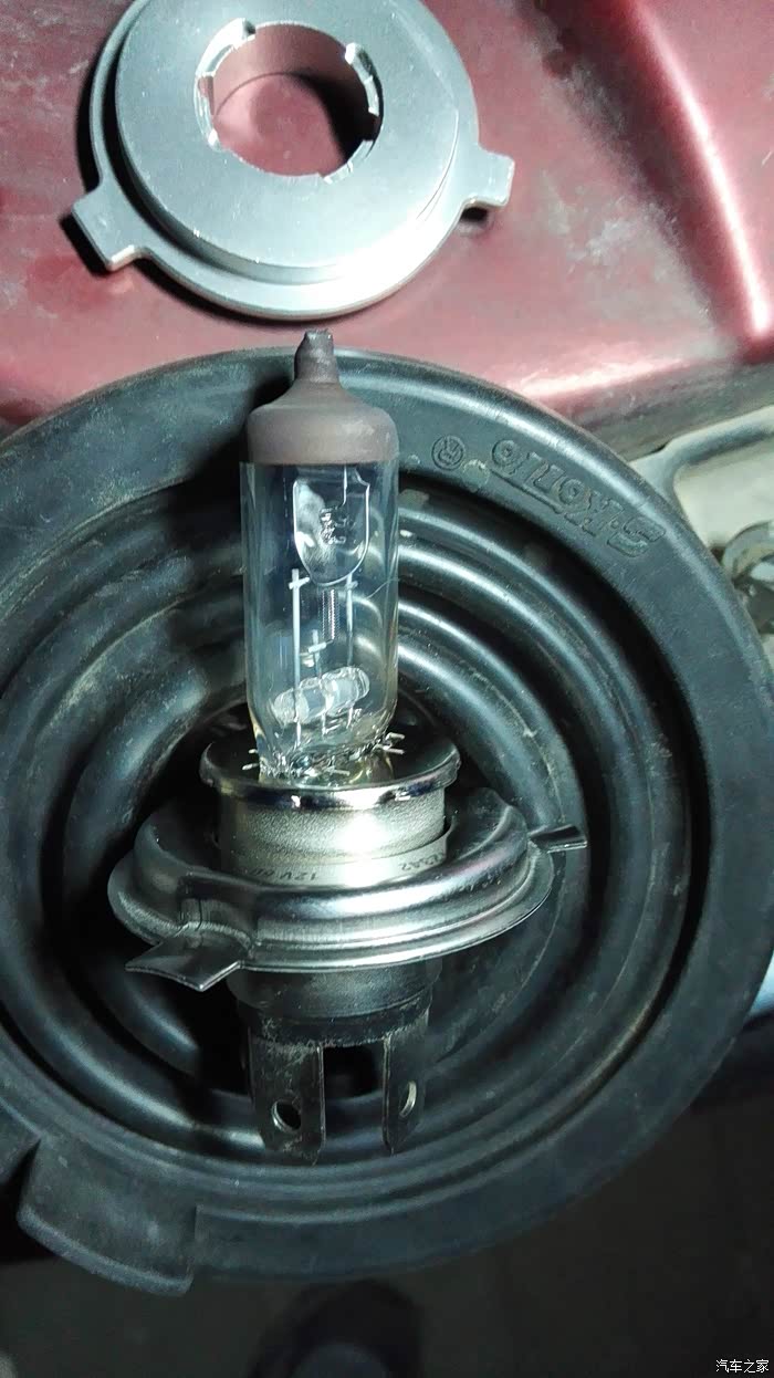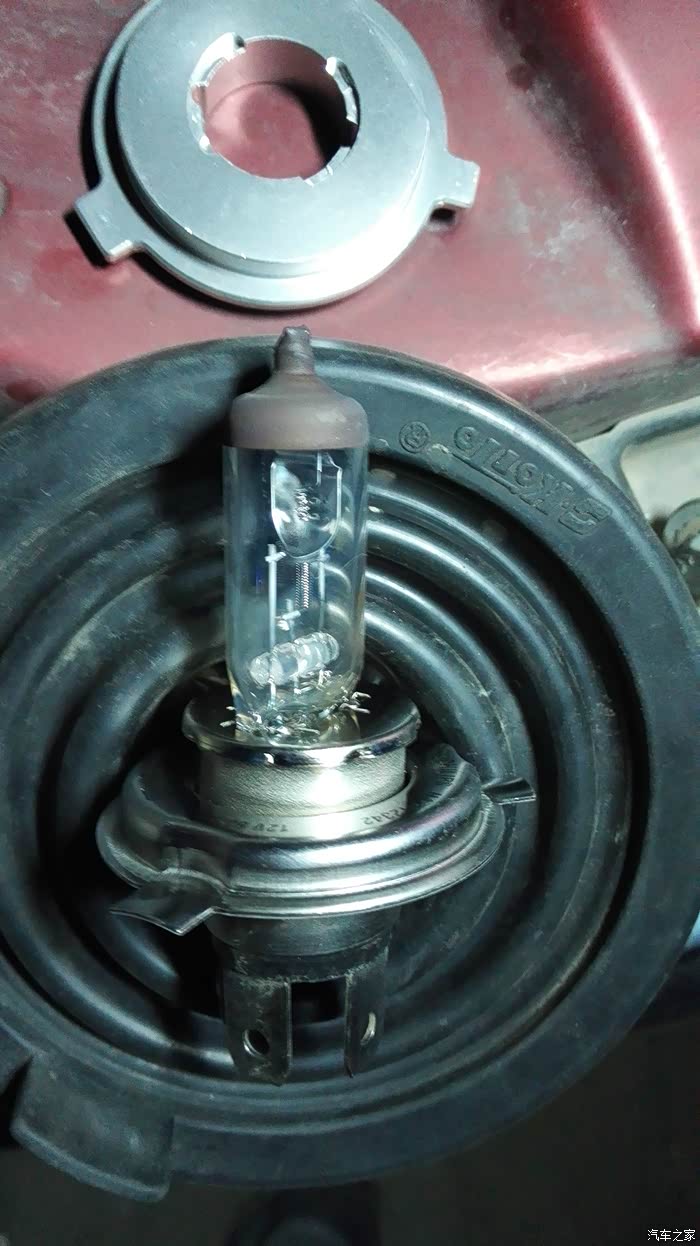 拆下来的卤素灯泡,细心的话可以看到一个近光灯乌丝已经烧掉了,只剩下一个远光的