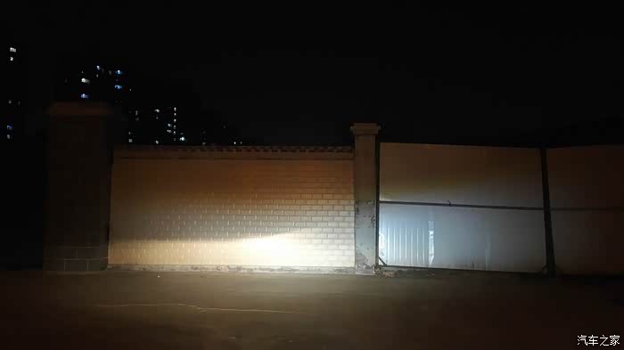 装好以后,开到了一个没有路灯的路口,正好这条路前面修路,围了一堵墙,是一个很好地测试场所,以来灯光能直接照射到墙上看到下过,而来靠近墙的地方也比较安全,不至于在马路上被追尾,图片中左边是LED,右边是原车卤素灯
