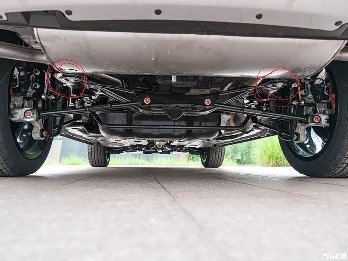 圆圈处负责承载,下方多连杆负责平衡,结构分工明确,各司其职,簧下质量更低,操控更出色。