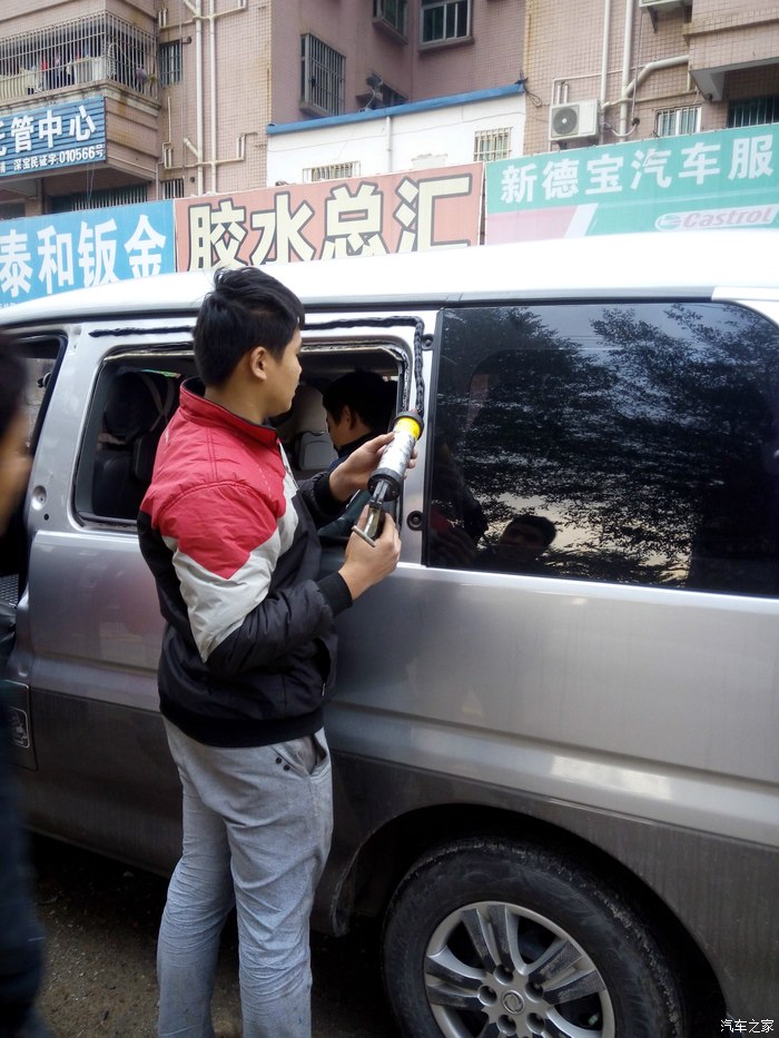 在框架四周打上一层厚厚的专有汽车玻璃胶!师傅很认真,赞一个