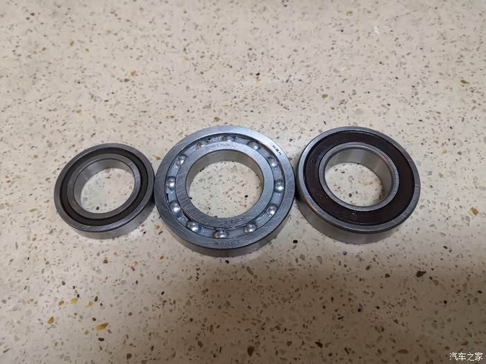 从左到右是上中下三个拆下来的原车轴承,上是非标24BSC03,尺寸24x40x8,中是16006,下是6005DU,我就是这个坏了,买不到这个单边密封的,就买了一个6005DDU双面密封的,一样可用。