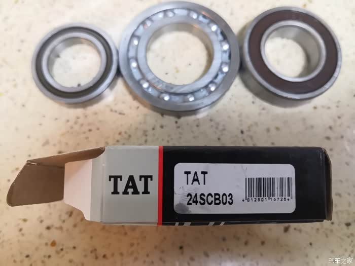 3.上中两个轴承网上nsk的进口件好买,下面非标的24BSC03,尺寸24x40x8,这个不好买,原车件拆下来是单边密封,最后只买了一个德国的牌子TAT,是开式不密封的,不知道影响大不大。网上买这个配件的时候一定要叮嘱店家型号尺寸别弄错,我买的时候,第一次店家发过来的型号尺寸不对,我问她,他说通用的,结果拆开方向柱以后,内径小了,没办法,车就扔在修理厂,重发了一个过来后今天才去装好的。为了弥补我,说是再给我发一个过来,让我备用。
