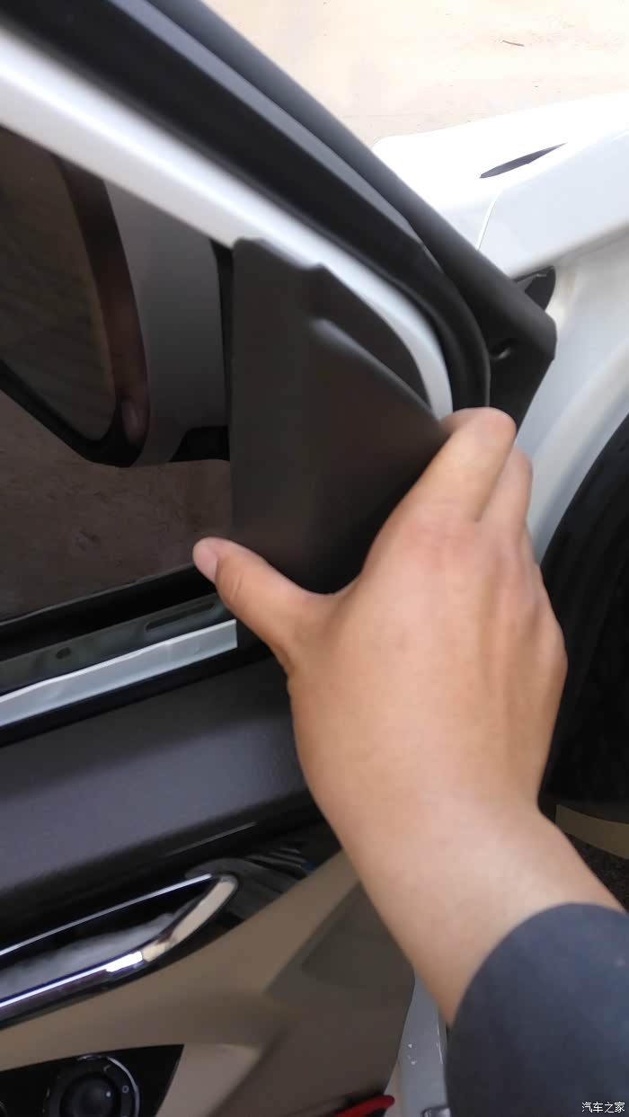 然后车窗右上角的三角盒拆下来,这个里面就一个卡扣拽一下就下来了。