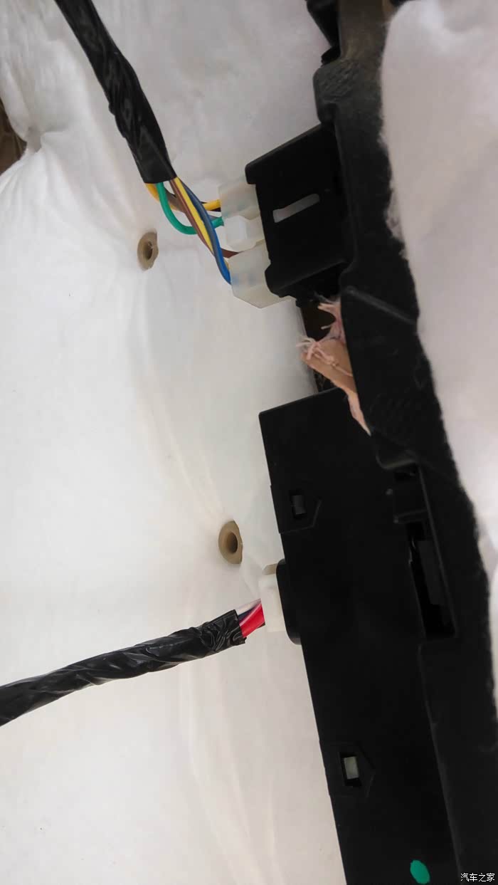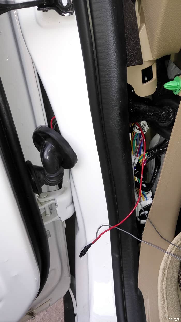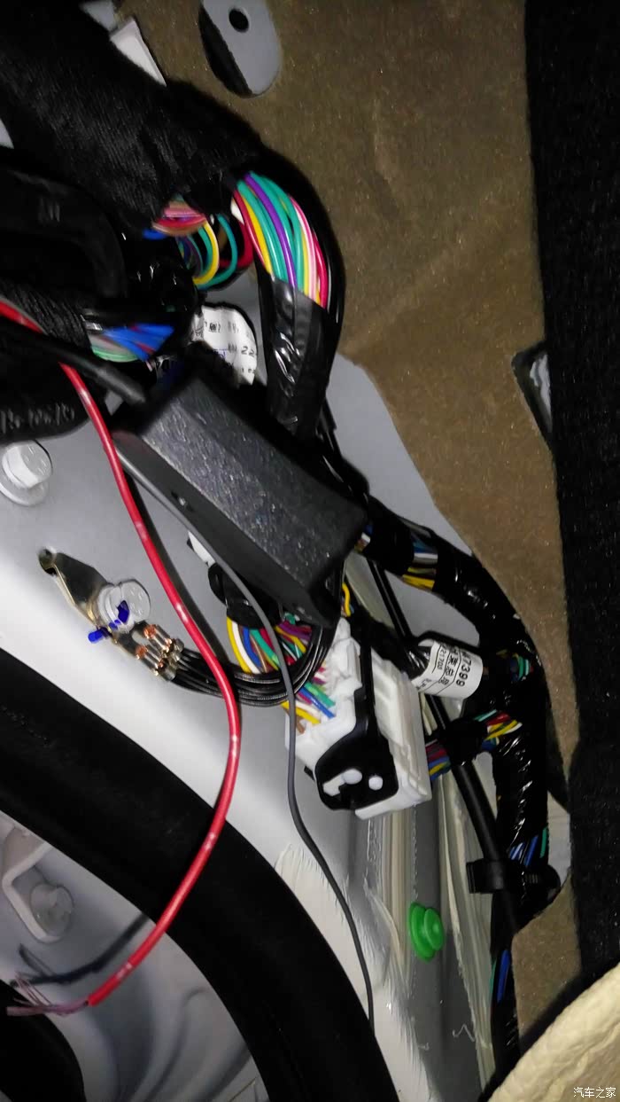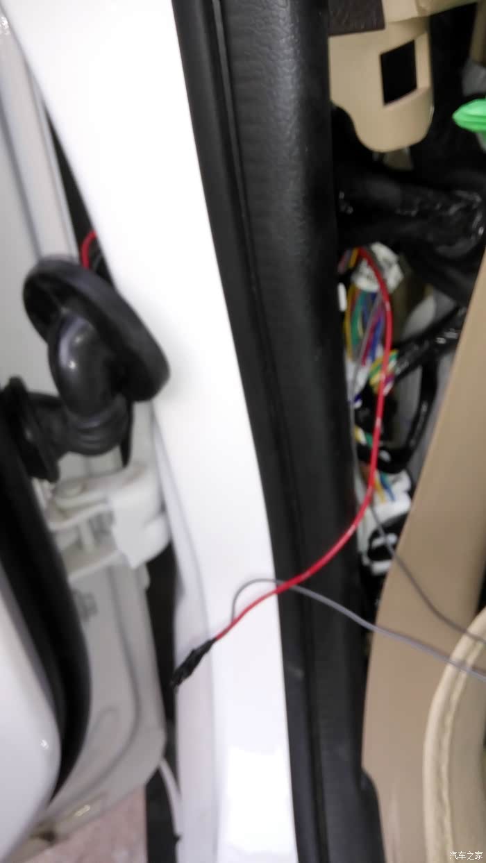 虎了吧唧的把线穿进去接好全部都装好非常完美的一次安装。可是试机不行,把我郁闷坏了,然后又拆开仔细的检查,都没问题。最后从卖家那里才知道16款电源线取电不用穿室内,用门里的绿线取电就可以。