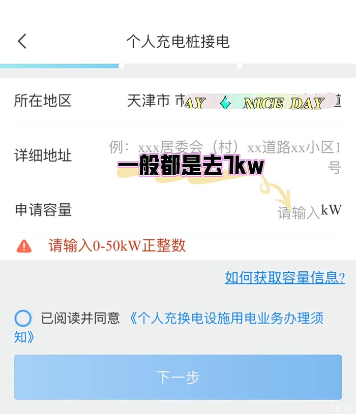 然后选择对应区域地址,就会出现办理需要的资料清单,只要依次办理准备好就可以拍照上传完成申请啦。另外在选择容量时选择7Kw就对了。