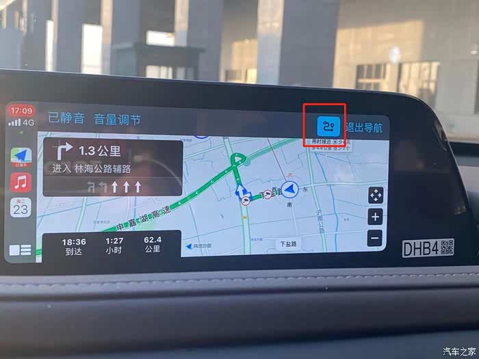 行驶途中,还可以选择观察全貌,再将光标移动至+-号,点击放大和缩小当前地图。本来是移动光标到上下左右选择查看地图上下左右,其实可以通过移动而并非旋转指令旋钮,就像刚才向右拨动指令旋钮选择进入carplay一样来控制上下左右