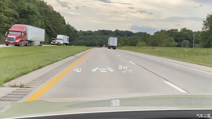 在无法识别车道或者车速过低的时候车道保持改为锁定前车。抬头显示车道两侧的双蓝实线消失,变为道路中间一条实线瞄准前车。