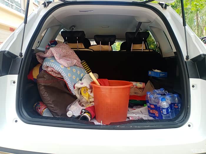 空间表现是最好的,后备箱里面放了小孩子的被褥,还有一个大桶,还是一个折叠床,这都还空着,是不是很大?