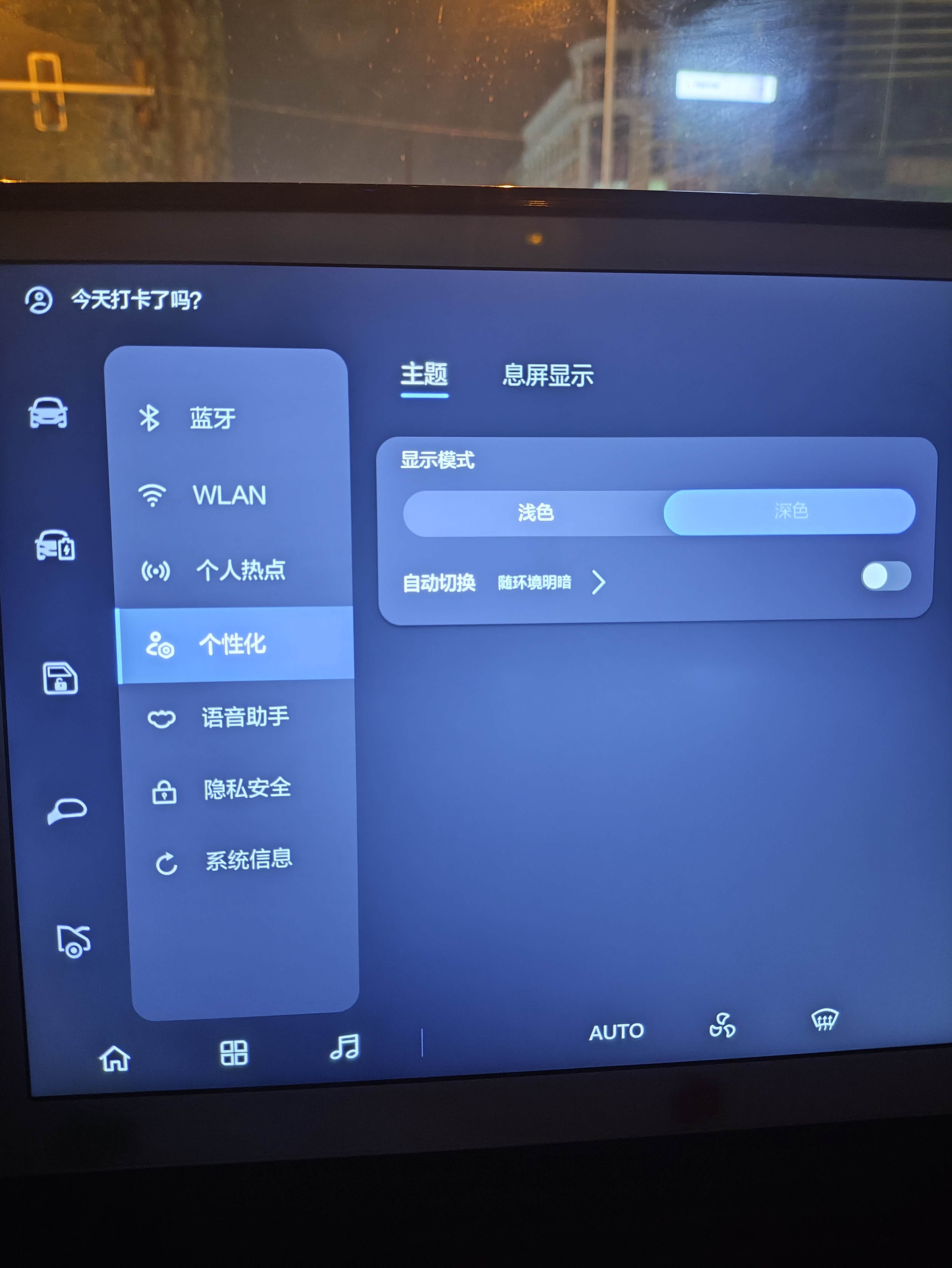 进入十月以后,天气逐渐变冷,天亮的晚,也暗的早了,每次调整屏幕都得手动操作,前几天研究了一下车机在设置里的个性化菜单里,仪表屏幕和中控屏有个选项是随环境明暗调节白色或者深色主题,省的来回调了,非常的贴心,在车库里再也不怕刺眼,夜晚开车也不怕了,自动化的设置让我很省心哦,大家还有没有什么小细节的设置呢?