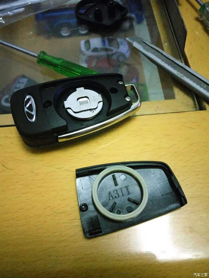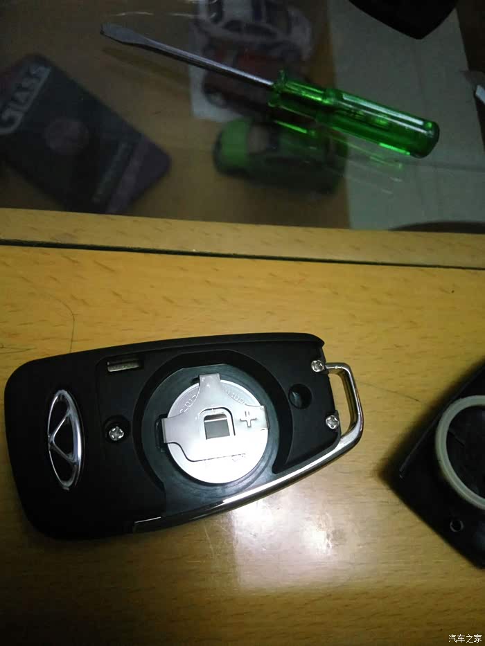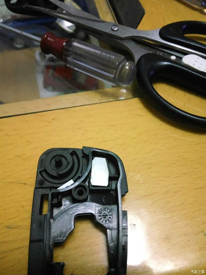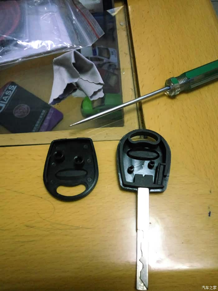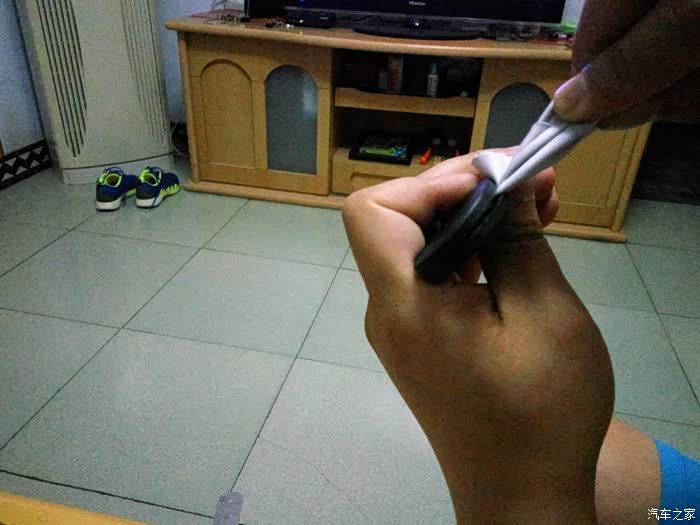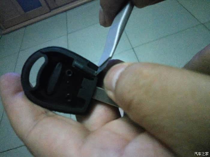 接着拆遥控钥匙。找到有奇瑞标的那面,还是从后部入手,钢板尺垫上软布,轻度用力,比开备用钥匙简单多了,原谅我图片的质量不佳,灯光线不好,焦点也没对好,一只手把持住,另一只手拍的。