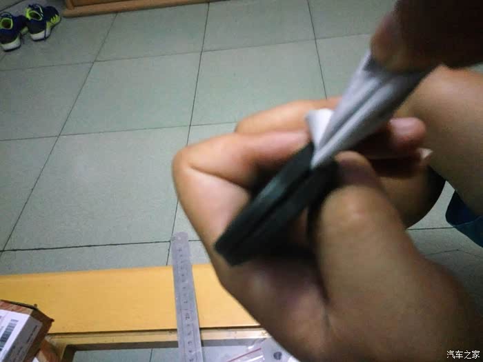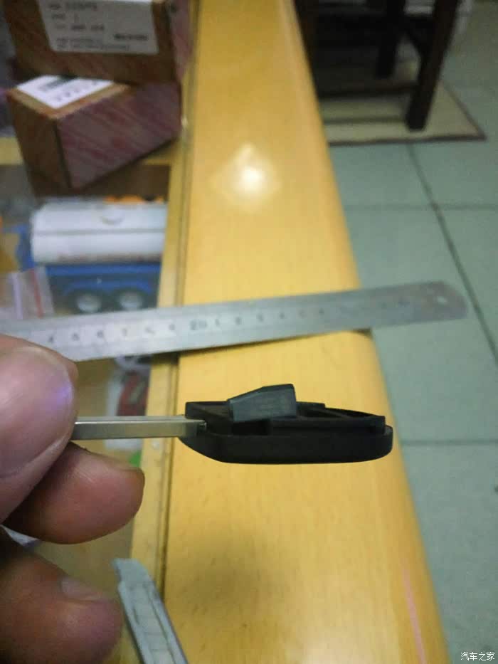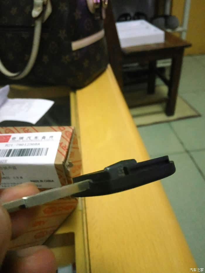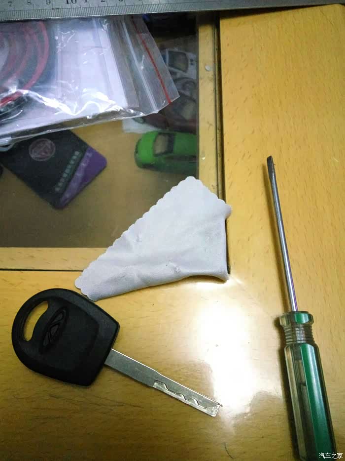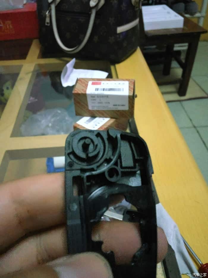 接着拆遥控钥匙。找到有奇瑞标的那面,还是从后部入手,钢板尺垫上软布,轻度用力,比开备用钥匙简单多了,原谅我图片的质量不佳,灯光线不好,焦点也没对好,一只手把持住,另一只手拍的。