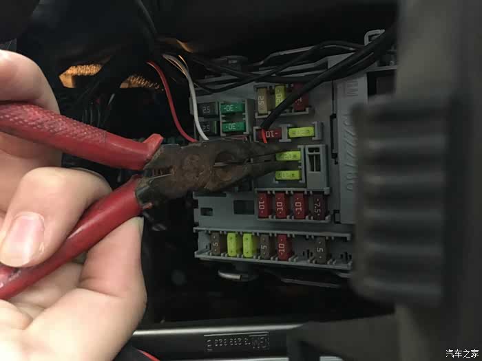 先将车辆断电,用尖嘴钳拔下图示这个保险丝