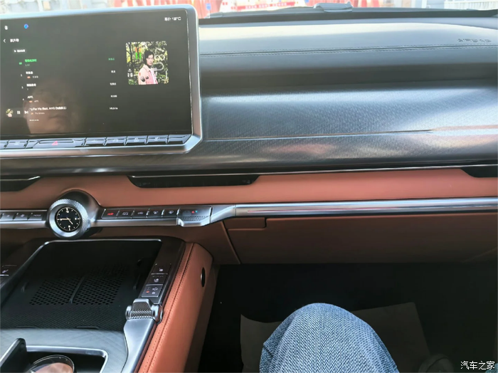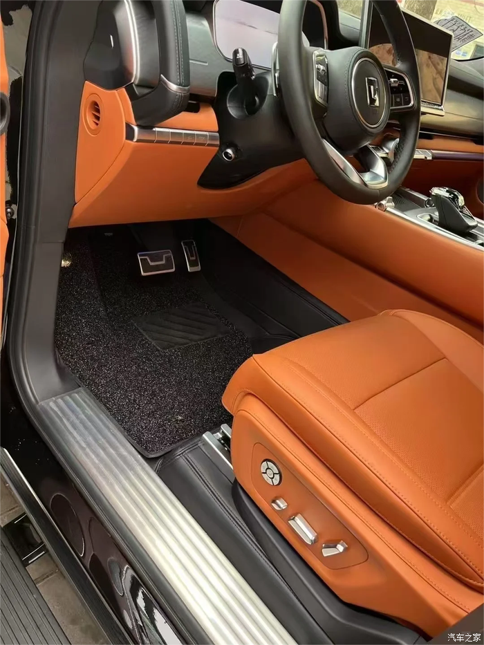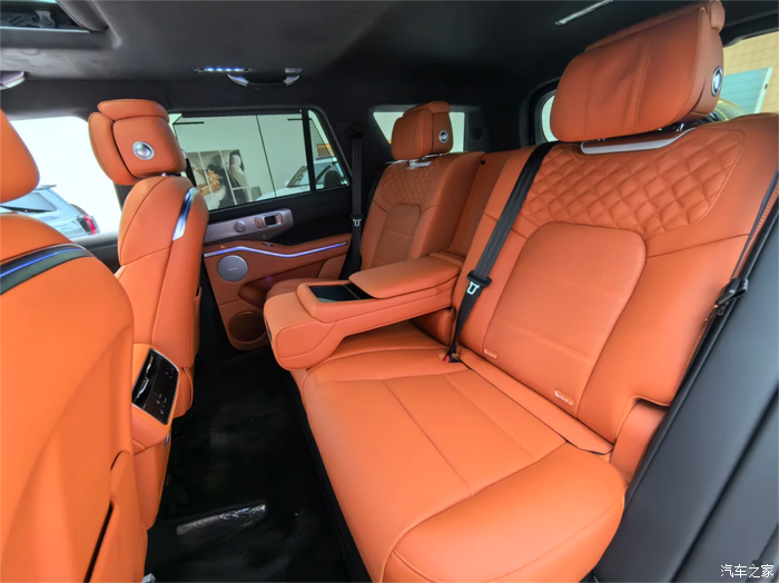 坐进驾驶座感觉宽敞,视野比普通SUV 高出一个档次。座椅包裹性好,腰部和肩部支撑到位。试了座椅功能,通风、加热、按摩一应俱全,按摩模式还能调力度,同级别少见这样的配置。中控台那块看起来科技又豪华,16.2 英寸中控屏显示清晰、操作流畅,下方金属实体按键质感出色。车顶翻毛皮手感柔软,和橘色座椅搭配视觉上很和谐。