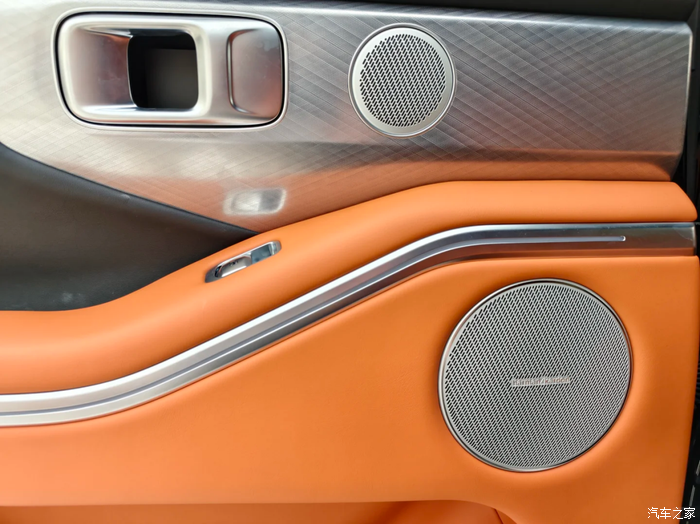 内饰细看的话会很惊艳,座椅菱形缝线工艺精致,按压能感受到饱满填充和扎实支撑。橘色座椅与中控台用银色金属饰条过渡,层次分明不杂乱。门板橘色皮质延伸至扶手,座椅菱形格缝线也是橙色的,细节处足见用心。