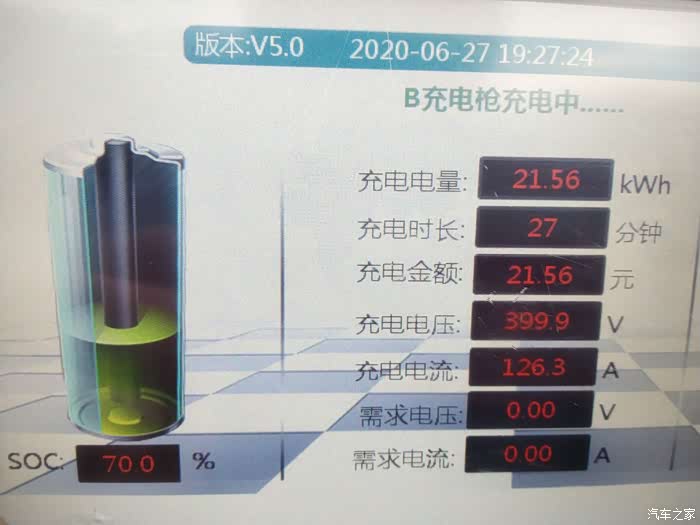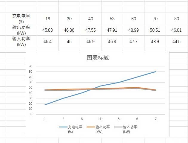 充到70%时电压399.9V,电流126.3A,功率=399.9V×126.3A=50.51kW