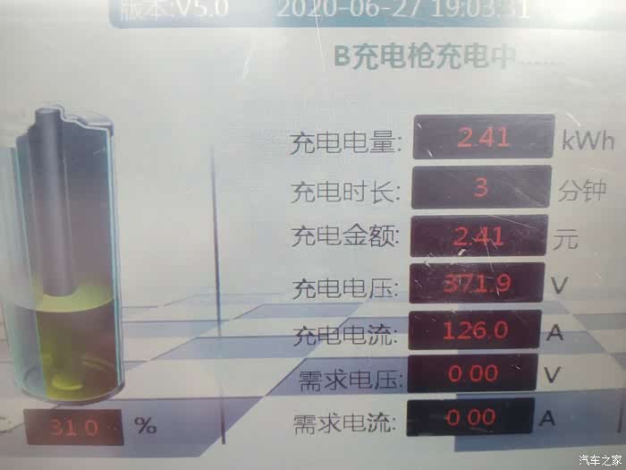 充到31%时电压371.9V,电流126.0A,功率=371.9V×126.0A=46.86kW