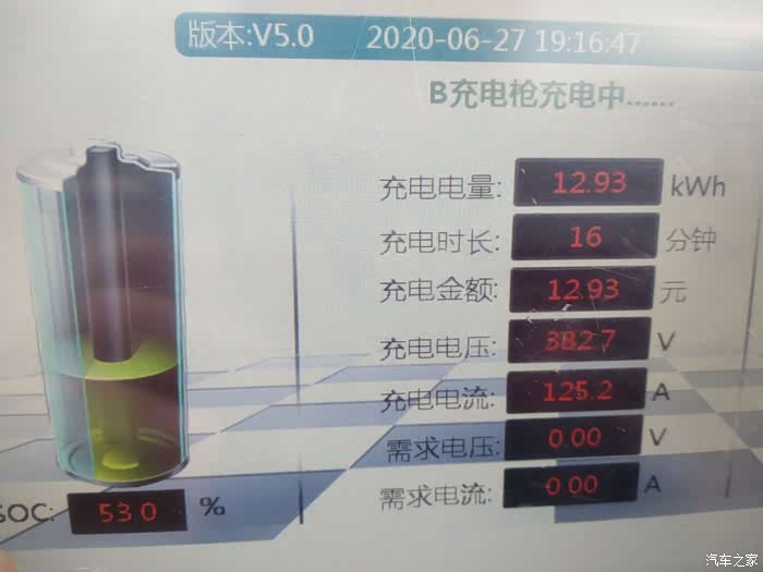 充到53%时电压382.7V,电流125.2A,功率=382.7V×125.2A=47.91kW