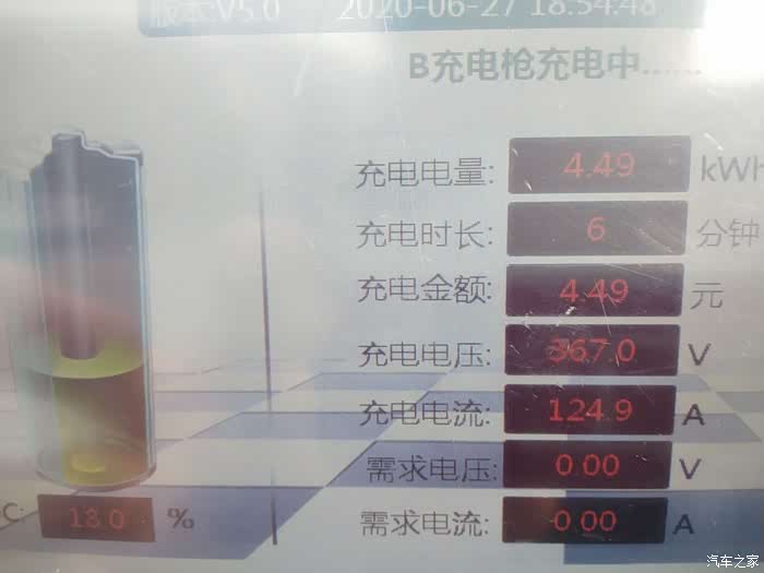 充到18%时电压367V,电流124.9A,功率=367V×124.9A=45.83kW