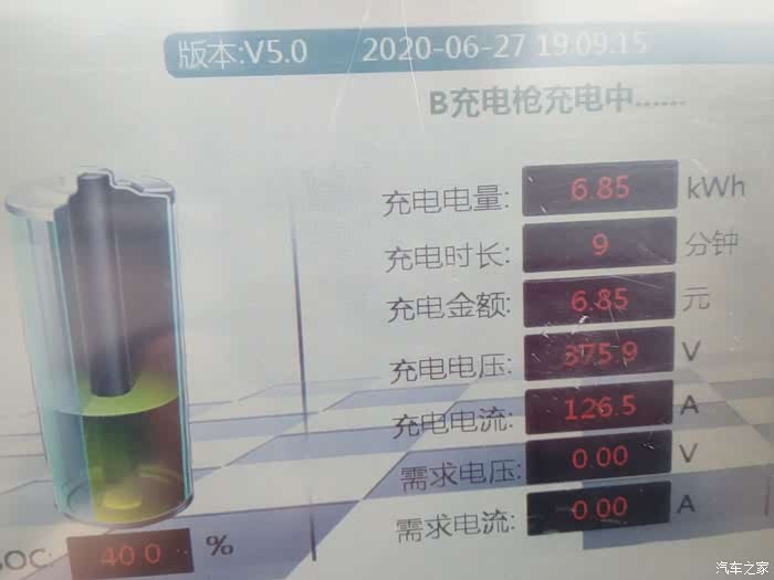 充到40%时电压375.9V,电流126.5A,功率=375.9V×126.5A=47.55kW