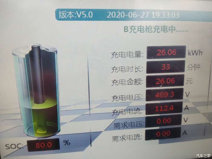 充到80%时电压409.3V,电流112.4A,功率=409.3V×112.4A=46.01kW