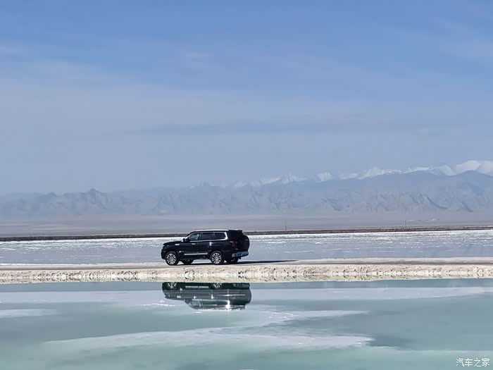 在世界上用盐埔就的最咸的公路上。60倒映在翡翠湖里。远处巍峨的昆仑雪山,若隐若现。