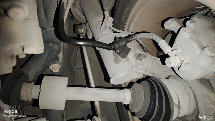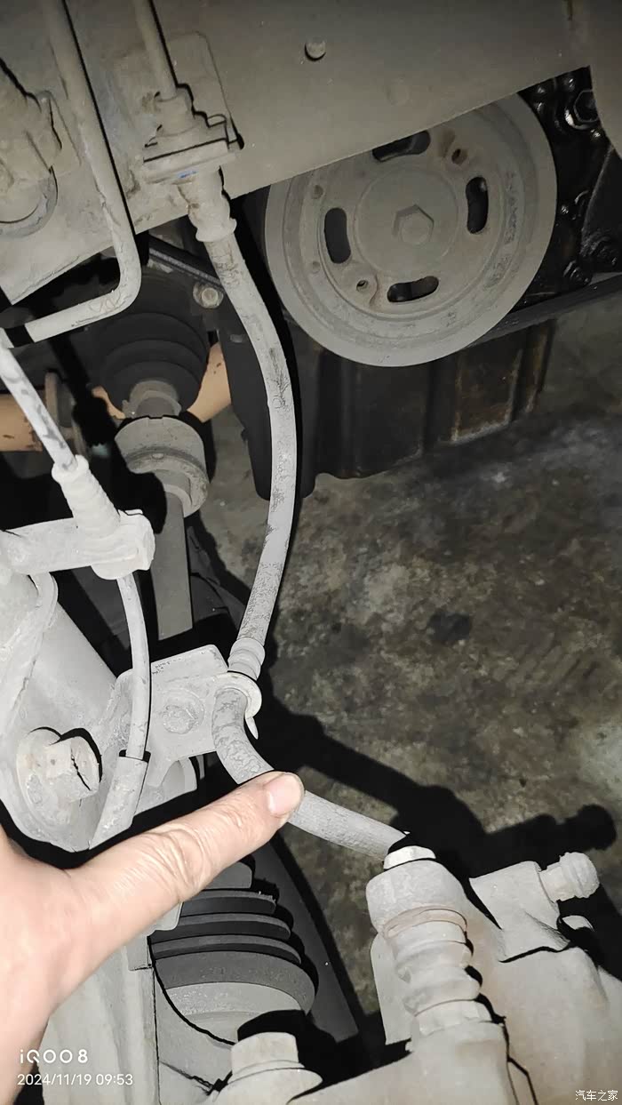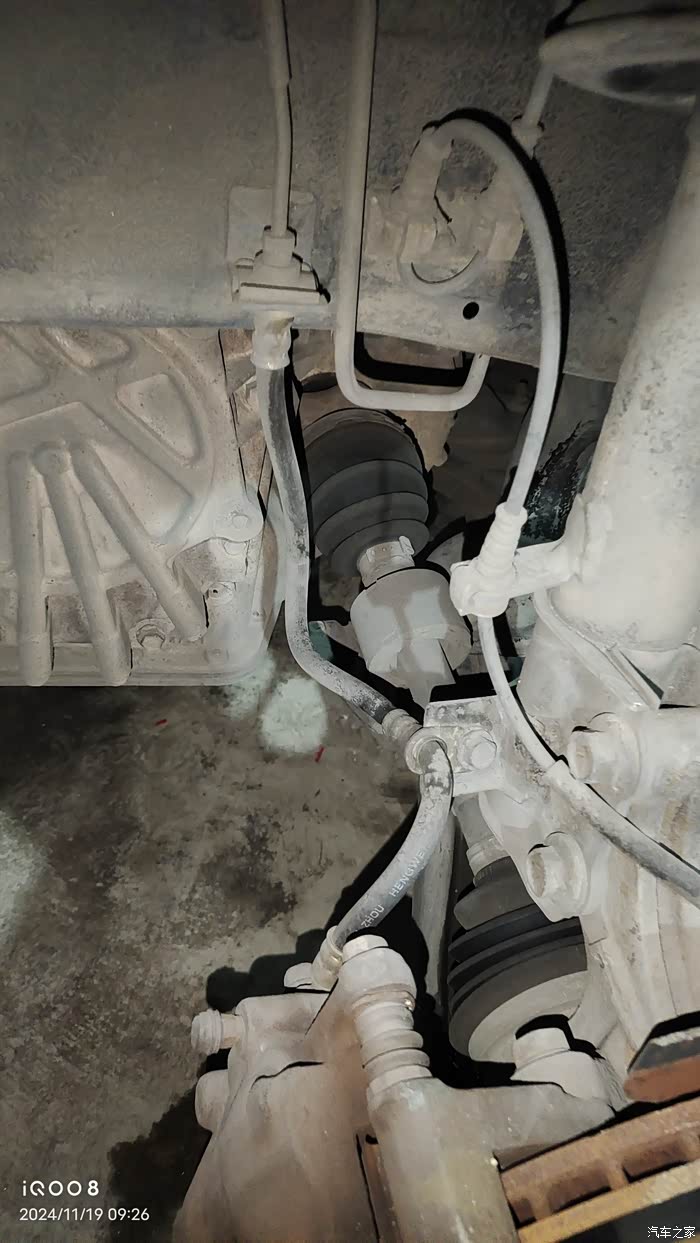 左边粗的橡胶管是刹车软管,右边是ABS,轮速传感器感应线束