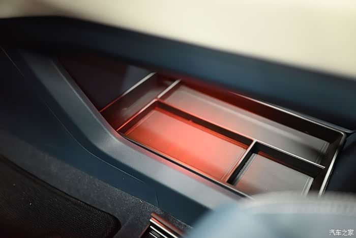 中控下方的储物空间,同样有氛围灯,另外我在淘宝买了分隔的盒子