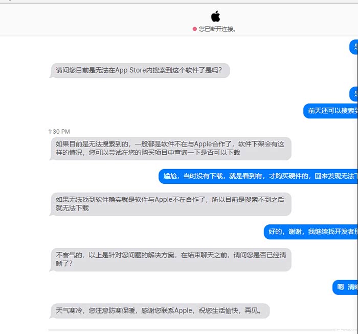 设备到手,打开APP商城居然没有了众e联的下载路径,求助在线客服,答复需要咨询苹果方,联系上苹果方之后答复开发者停止合作了,转而回来继续400联系,答复反馈沟通。