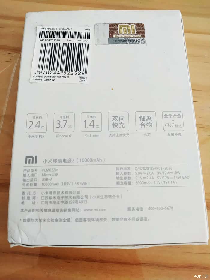 今天就给大家说说这款小米出品的10000mah移动电源,这枚小米移动电源是用众测积分兑换的,老型号的只有一个输出接口,对小米家的产品还是比较放心的,容量10000毫安,一般够手机充电两次了,旅行.应急都没有问题,它的整体颜色为银色,正面有汽车之家定制版的logo,下面有小米的商标,上端右侧有一个电量检查按钮,按下会由四个白色指示灯显示充电宝电量,左面是usb输出接口和micro usb输入接口,最普通的数据线就可以为它充电。