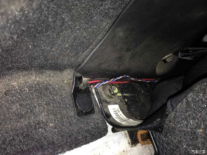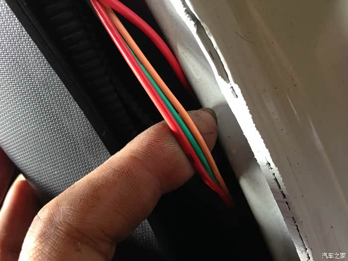 接下来就是接线了,首先扒开驾驶座的B柱安全带处的盖板,就会看到一条黑色波纹管,管内就三条线(红、绿、橙),把电机马达接在红、绿两条线上就可以了。