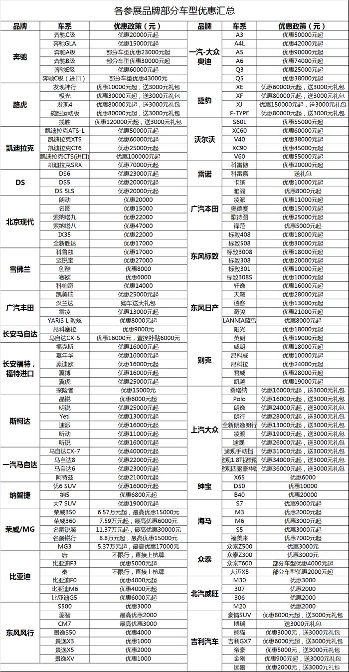 活动车系:北京奔驰- | 北京汽车- | 北京现代- | 比亚迪- | 长安福特- | 长安马自达- | 东风标致- | 东风风行- | 东风雷诺- | 东风日产- | 东风裕隆- | 广汽本田- | 广汽丰田- | 吉利汽车- | 捷豹(进口)- | 路虎(进口)- | 上汽大众- | 上汽大众斯柯达- | 上汽集团- | 上汽通用别克- | 上汽通用凯迪拉克- | 上汽通用雪佛兰- | 一汽-大众- | 一汽马自达- | 众泰汽车-