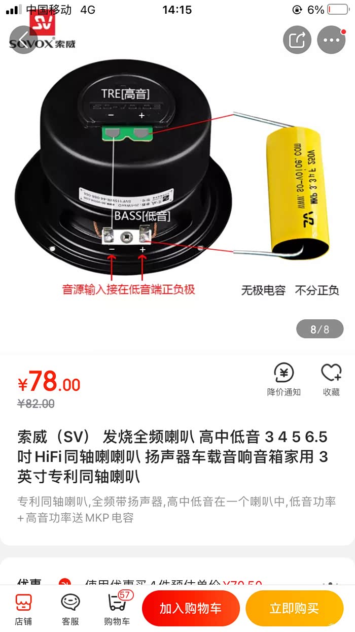 某东截图,69元两个3寸羊毛盆同轴喇叭,送MKP电容