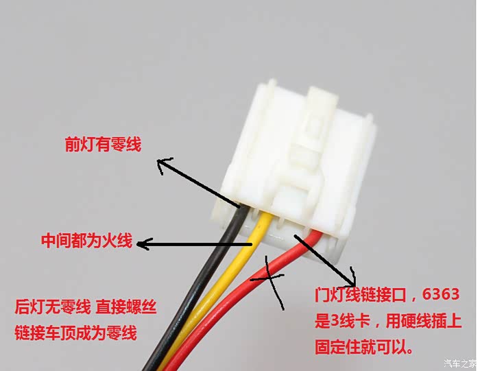 前面的灯有火线零线两根,插头是3线插头空位插口就是门灯线,用合适的硬线链接门灯线插进绑好就可以(门灯开关就一根零线)